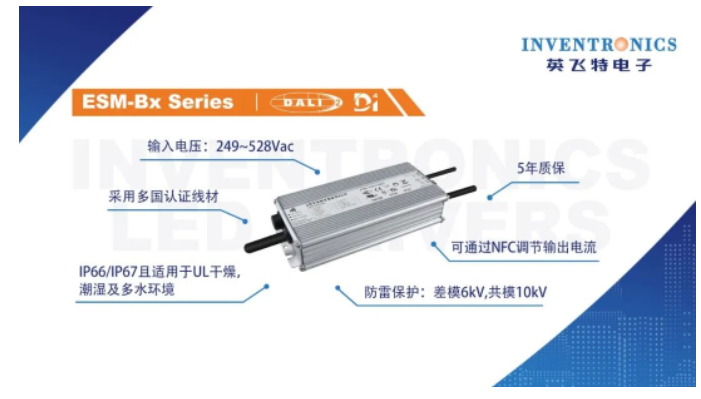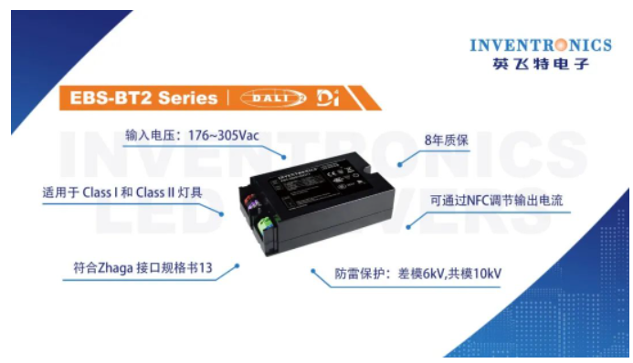 公司近几年主推的EUM-Bx系列、ESM-Bx系列以及针对欧洲市场的EBS-BT2系列等,均已获得了DALI-2、D4i认证,功率段涵盖了40W~680W区间,输入电压覆盖了90-305Vac,176-305Vac和249-528Vac等全球电压范围。这些认证电源具有更好的系统互通性,为照明设备的物联网化、智能化扩展提供了可能性,同时为照明设计创造了更多想象空间。
